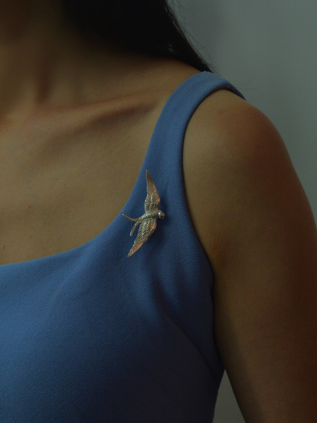 Notice the subtle, artful asymmetry of its wings—one poised slightly higher than the other, as if catching an upward draft. This is the mark of true craftsmanship, a deliberate touch that gives the swallow a vibrant, lifelike presence. When light dances across its surface, it catches the intricate etchings on its wings, making the silver shimmer like morning dew on a bird in flight.